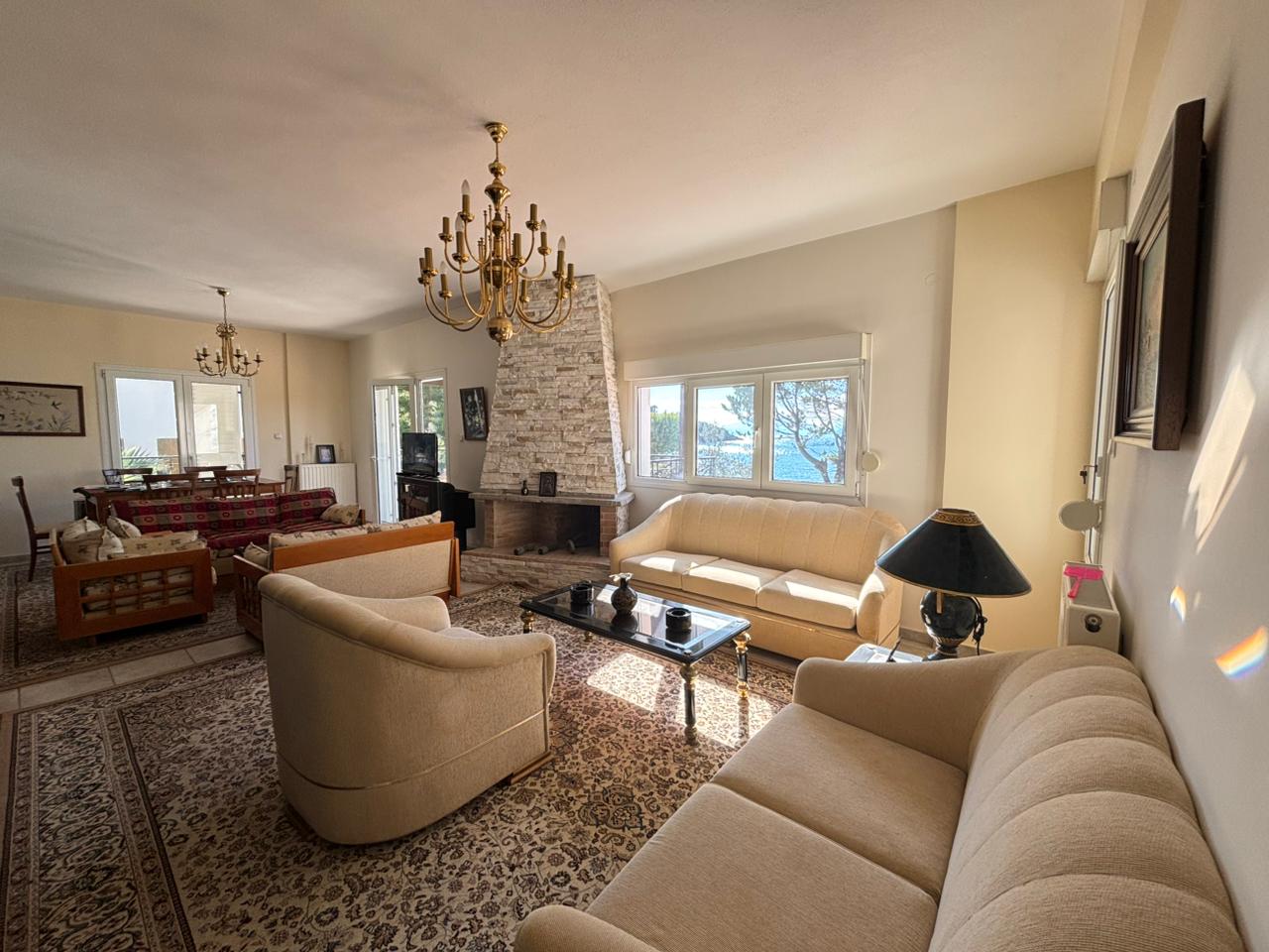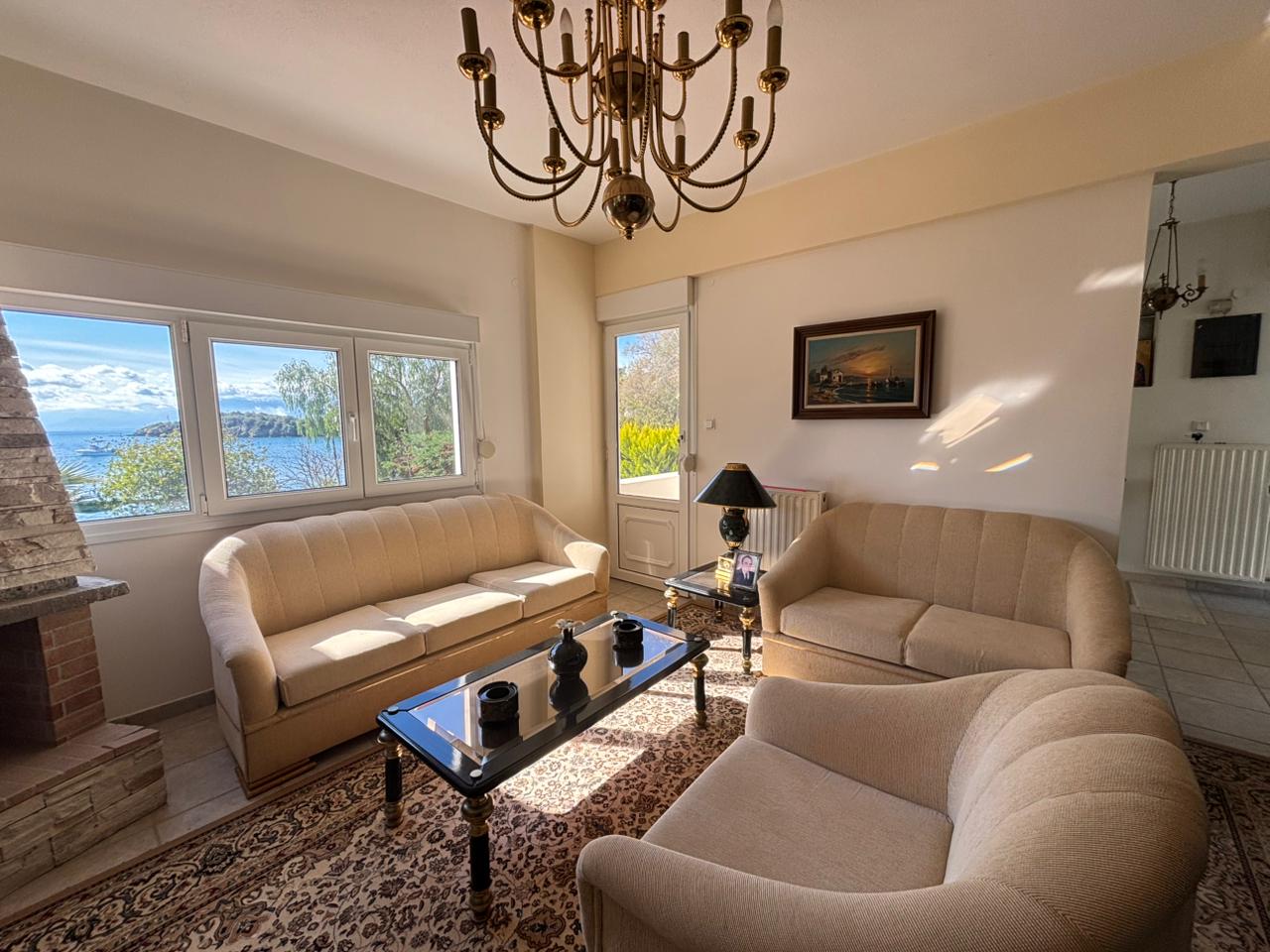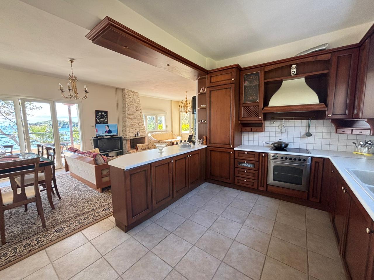 Via an internal marble staircase, we ascend to the second level, where the main entrance of the house is located. This level consists of a living room with fireplace and dining area, a spacious open-plan kitchen equipped with built-in appliances, 1 bedroom and 1 WC. From the second level, there is access to a large veranda with sea view.