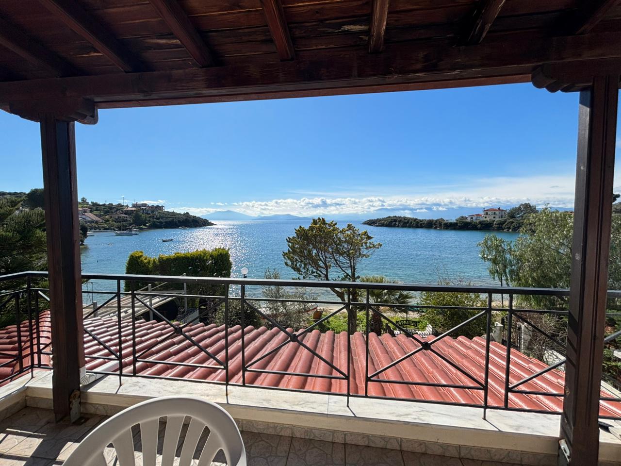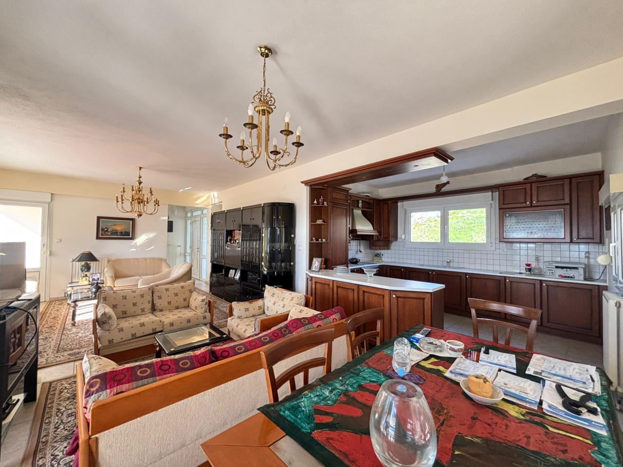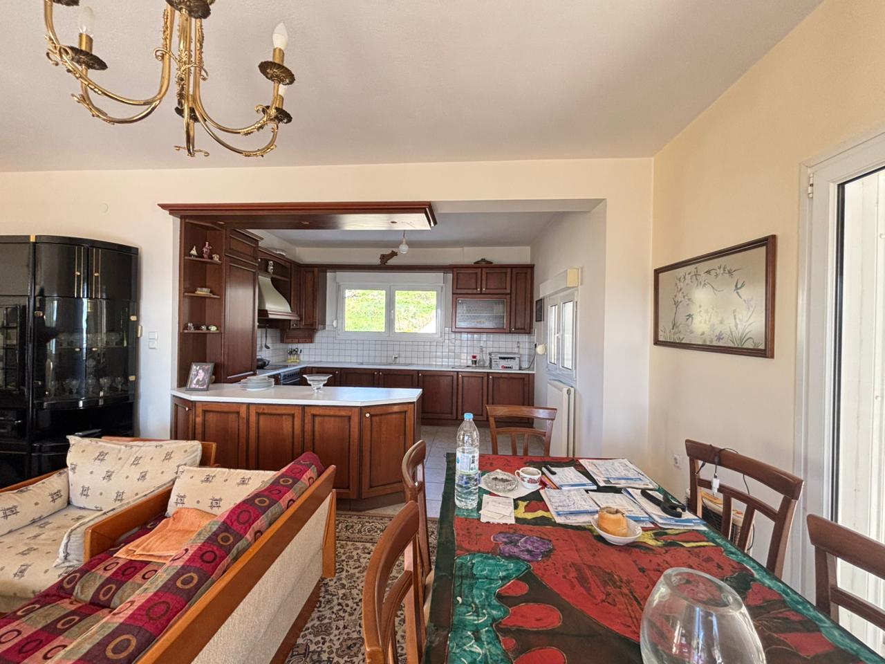Via an internal marble staircase, we ascend to the second level, where the main entrance of the house is located. This level consists of a living room with fireplace and dining area, a spacious open-plan kitchen equipped with built-in appliances, 1 bedroom and 1 WC. From the second level, there is access to a large veranda with sea view.