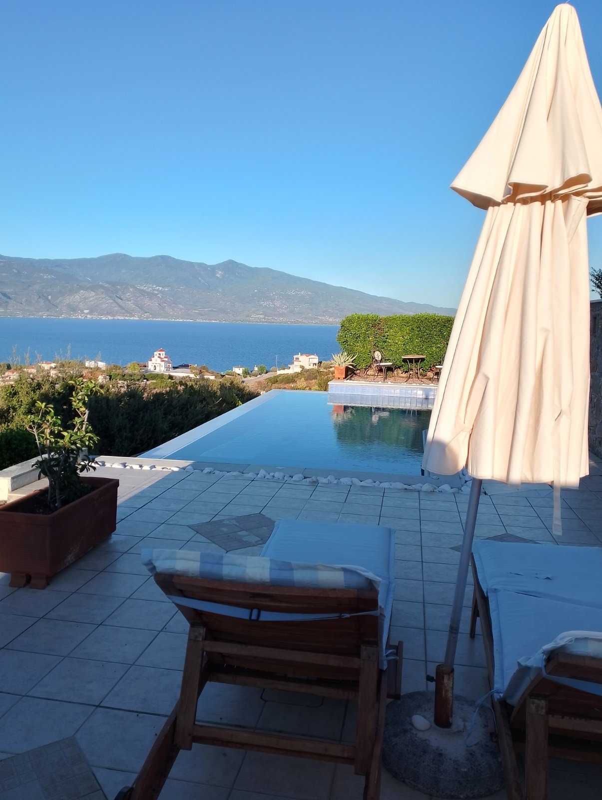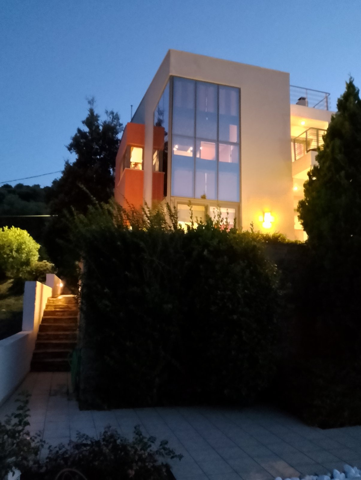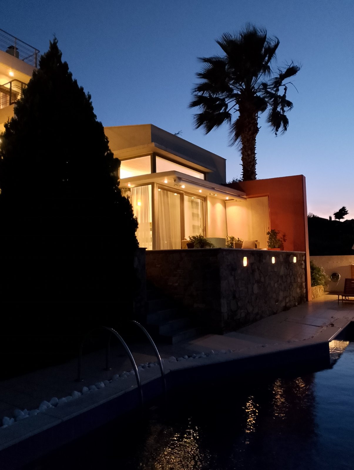 The unlimited view was the architect’s dominating thought while designing the villa, resulting to spectacular views from all parts of the house , “home with view” as mentioned in an architectural magazine that hosted the villa. The interior of this luxury villa is modern, elegant and comfortable with plenty of room to relax or entertain your guests. Once inside, the visitors of the villa will be greeted with spacious rooms, showcasing a design that mixes special decorating elements with highly functional modern furniture and appliances. Other features of the villa include air conditioning in all bedrooms and living rooms, the simple yet elegant dining and living area with a fireplace and a fully equipped open plan kitchen and storage area. The exceptional interior furnishings and contemporary minimalist design make this villa, one of the most desirable ultra stylish homes. Now it can be yours for a once in a lifetime experience. Tucked away in a quiet area, 10mn walk from the closest beach…your summers and winters will never be the same!