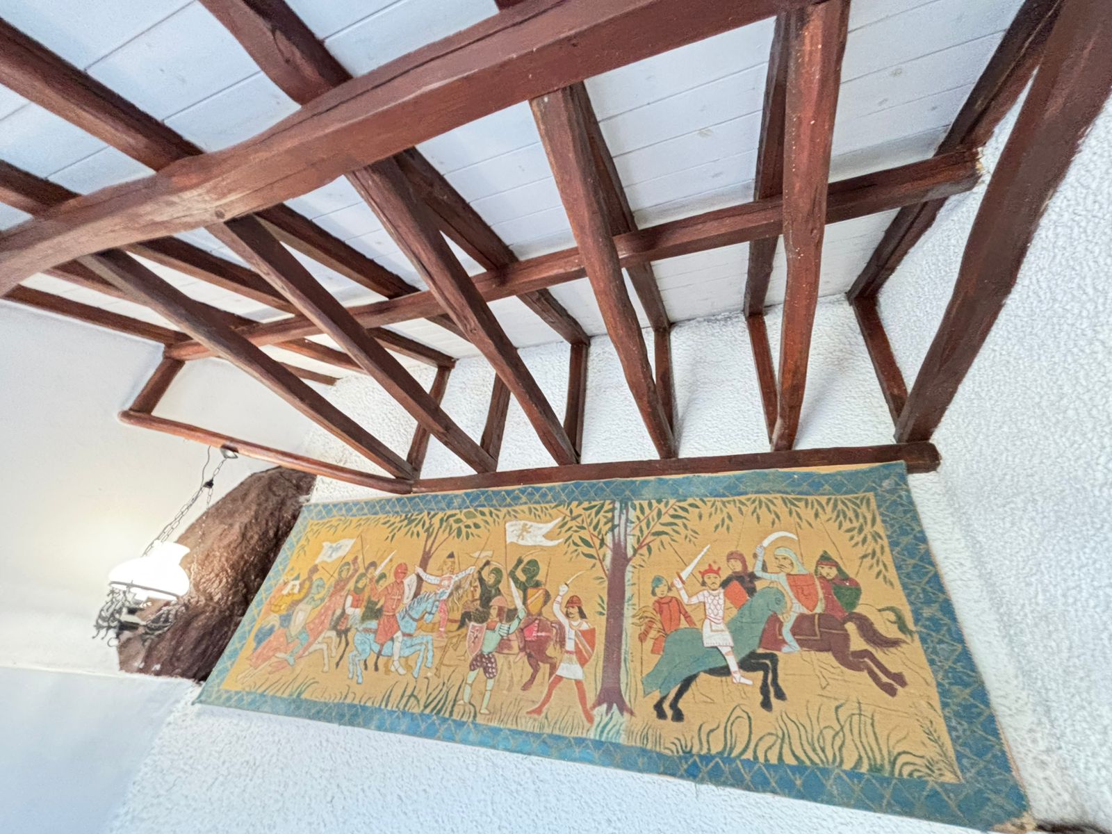 Entering the ground floor, we find a unique living room with a fireplace, two bedrooms, and a bathroom.
